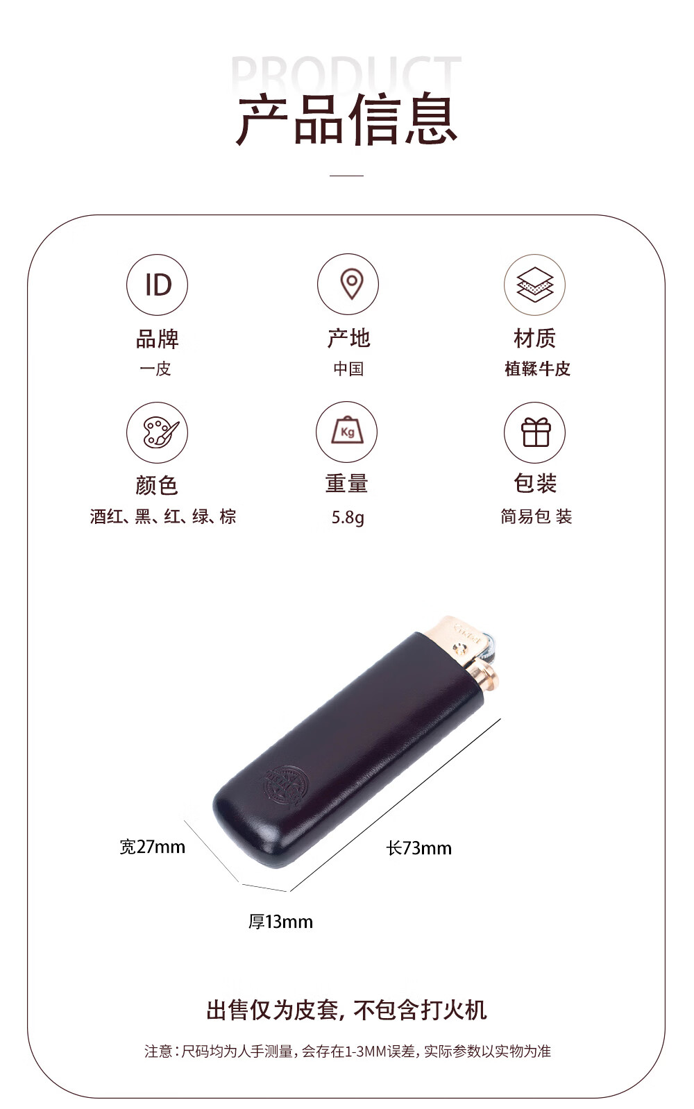 一皮(ONE LEATHER)草蜢打火机皮套真皮手工无缝工艺 草蜢打火机套礼盒个性高档礼品 酒红色礼盒(含打火机)
