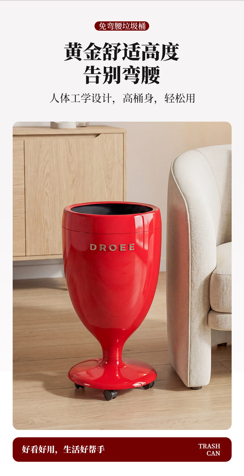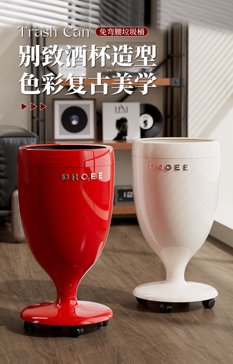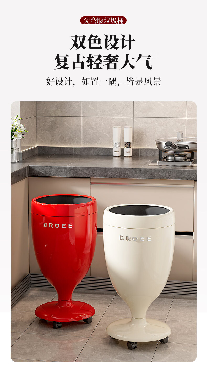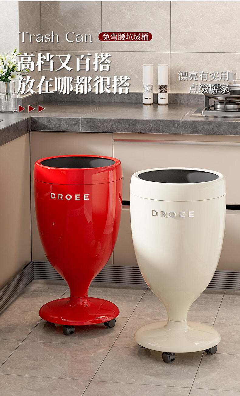 艾仕可(ASCOR)创意高脚杯免弯腰垃圾桶轻奢高颜值家用客厅厨房大容量带轮可移动 奶油白【大敞口设计-四滑轮款】