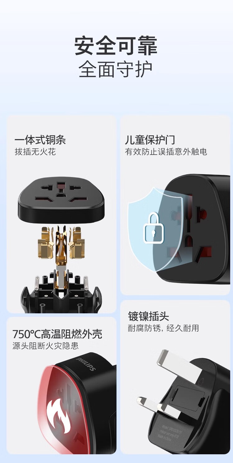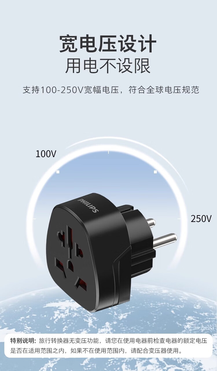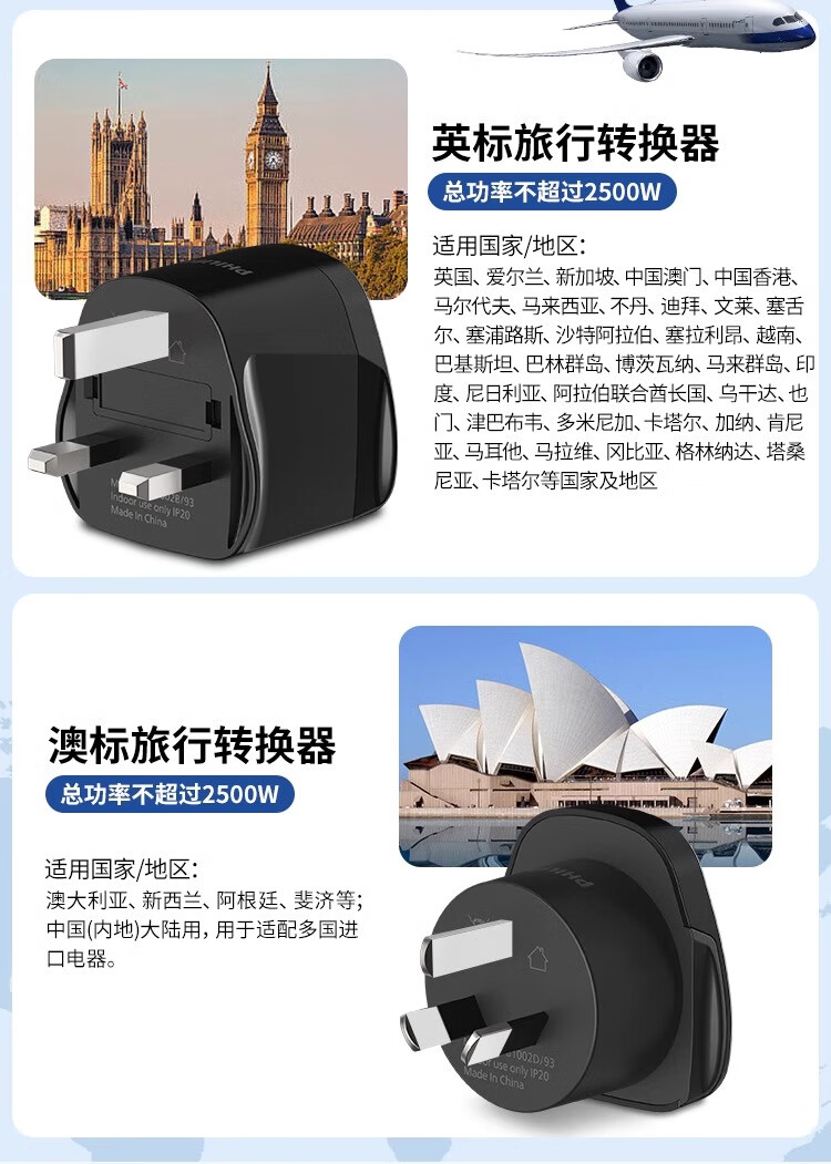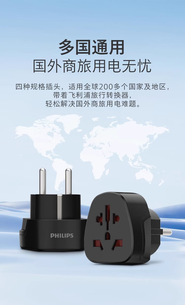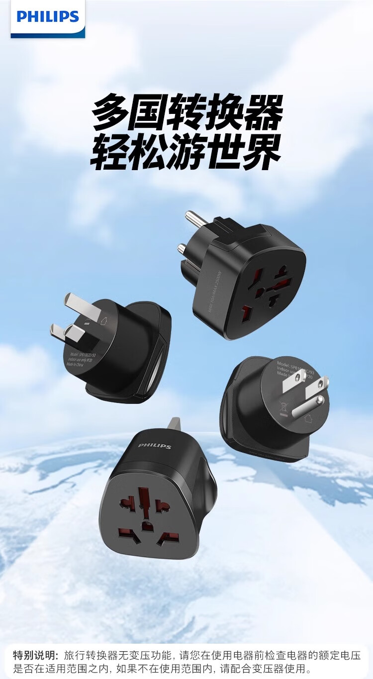 飞利浦(PHILIPS)出国转换插头英标/欧标/美标/澳标多国旅行转换器一转多国适用韩国美国日本东南亚欧洲 英标转国标