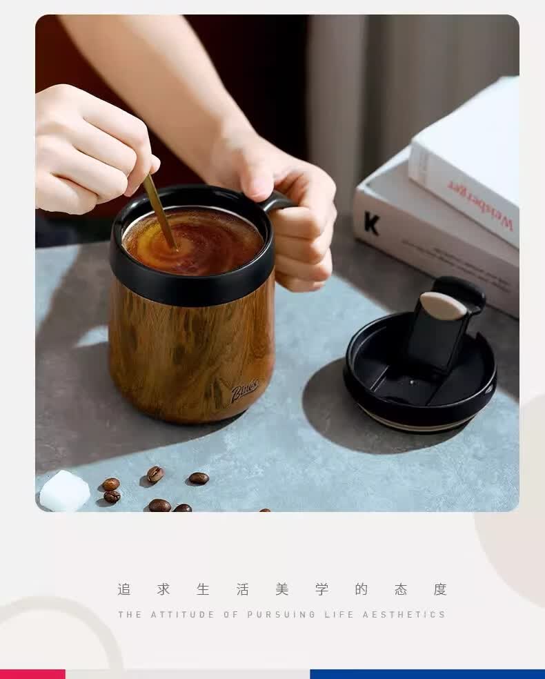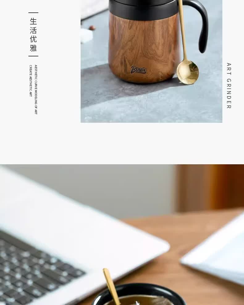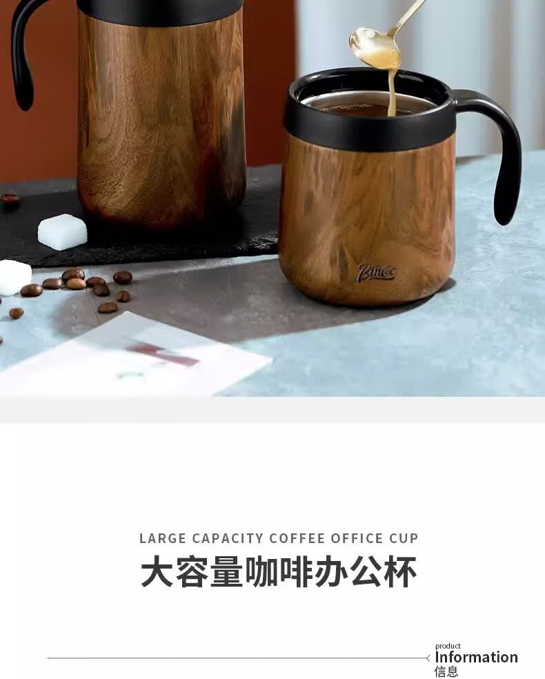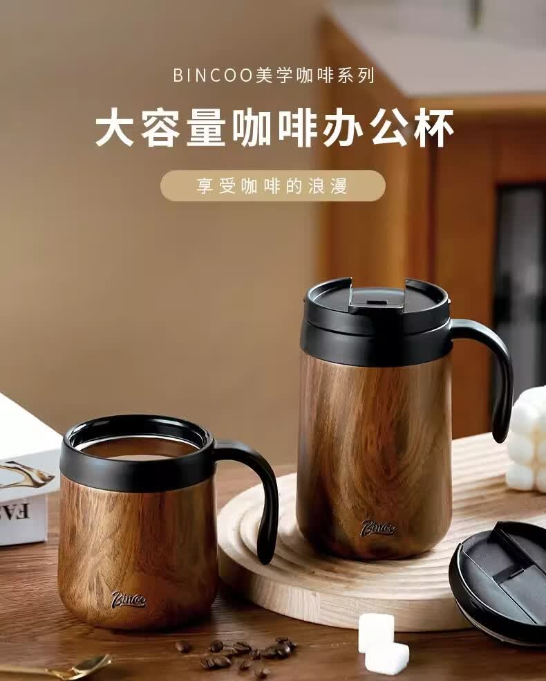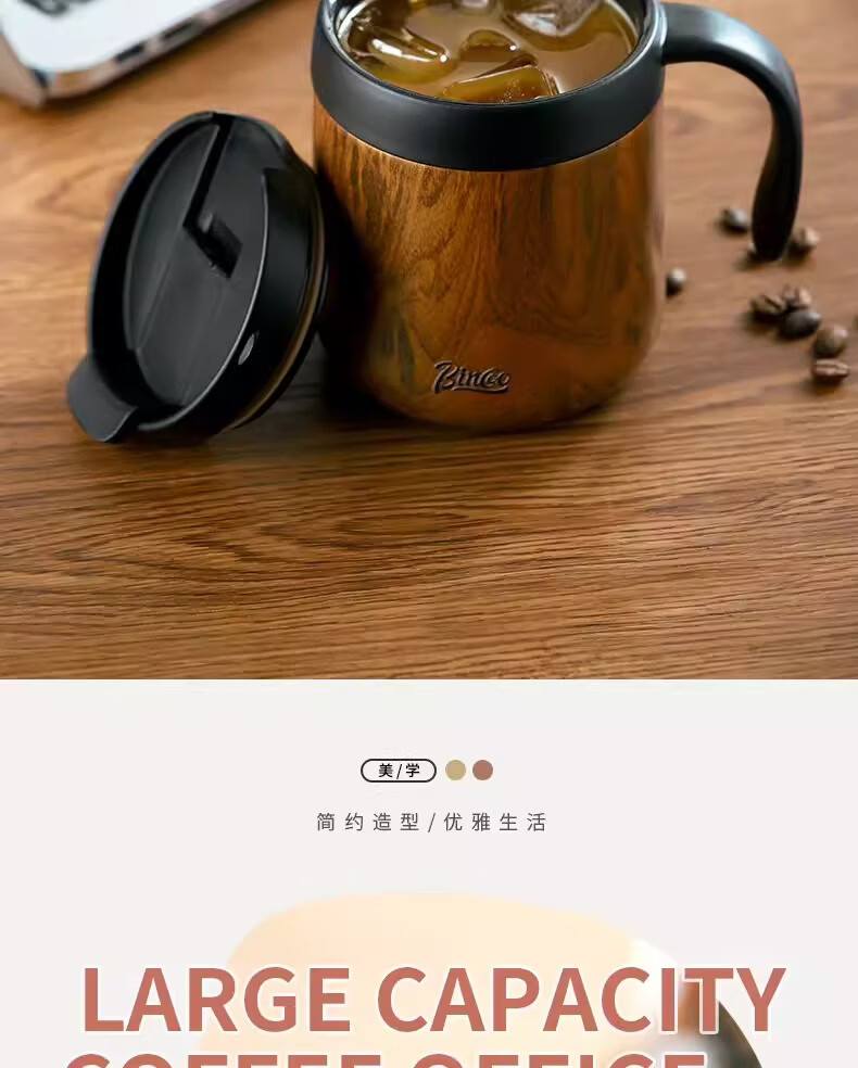 Bincoo不锈钢马克杯带盖办公室杯子保温咖啡杯高颜值家用水杯茶杯 木纹色咖啡杯-350ml