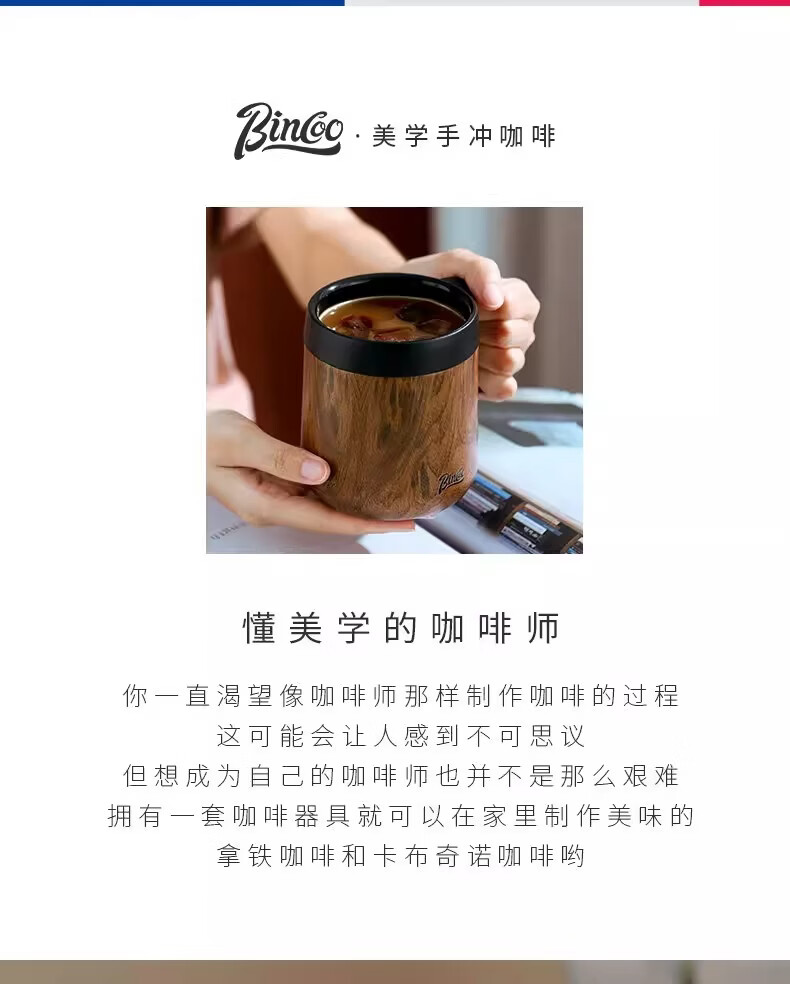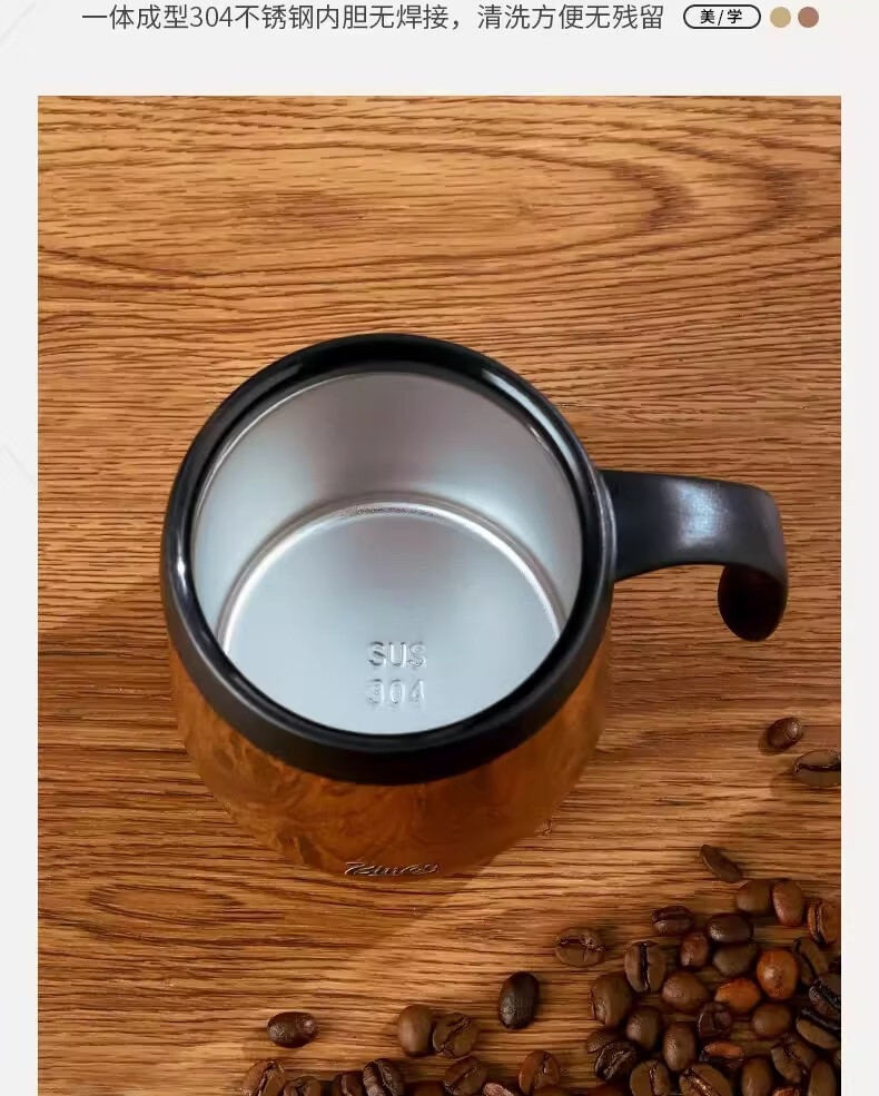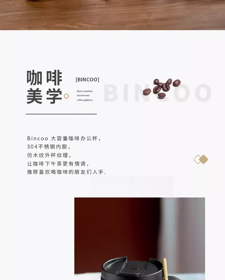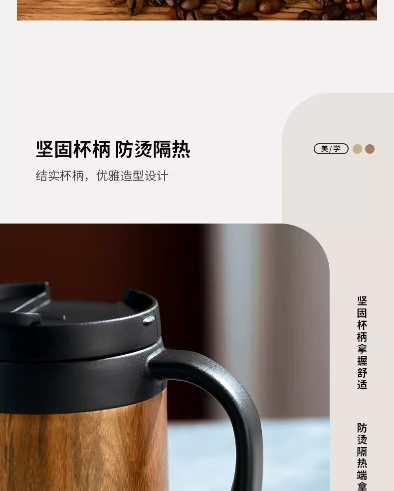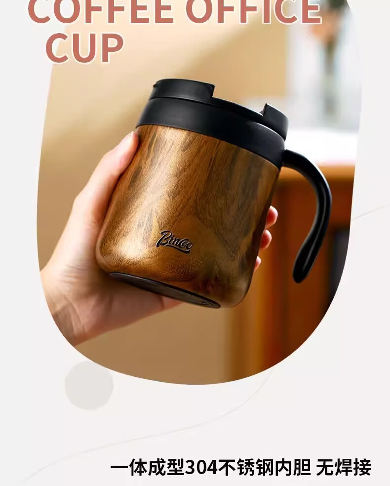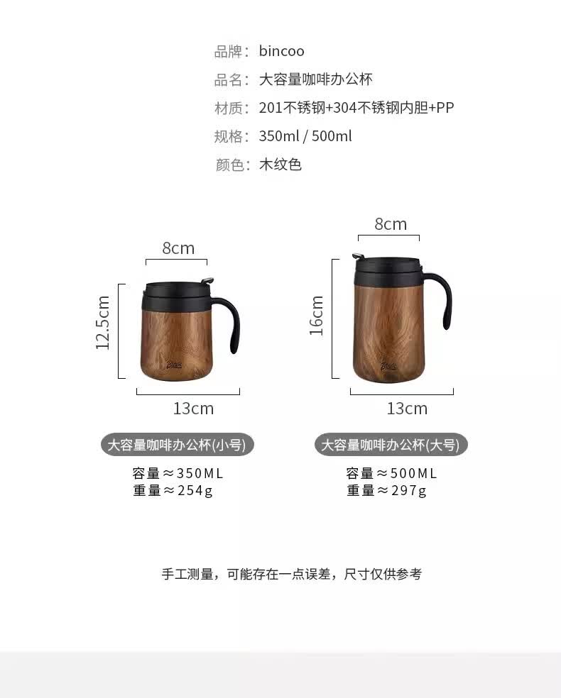 Bincoo不锈钢马克杯带盖办公室杯子保温咖啡杯高颜值家用水杯茶杯 木纹色咖啡杯-350ml
