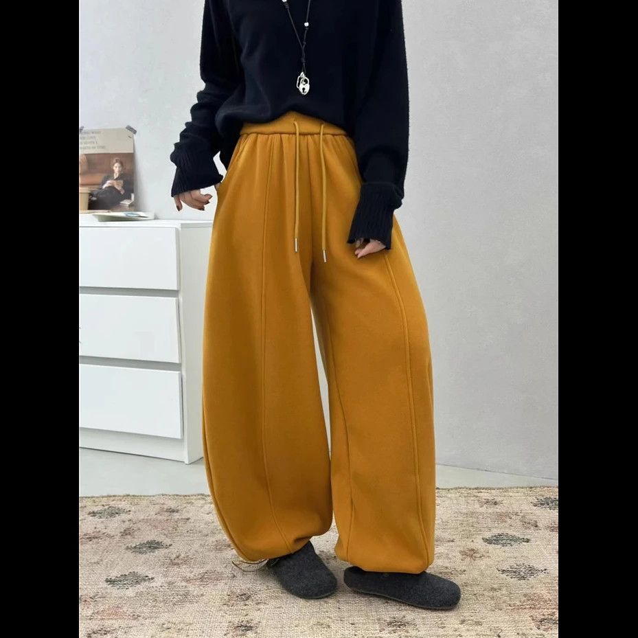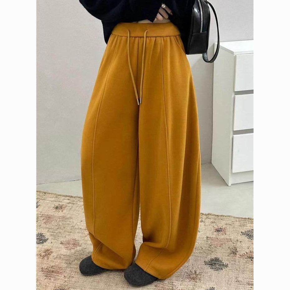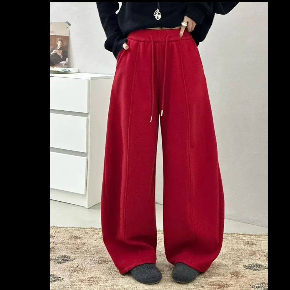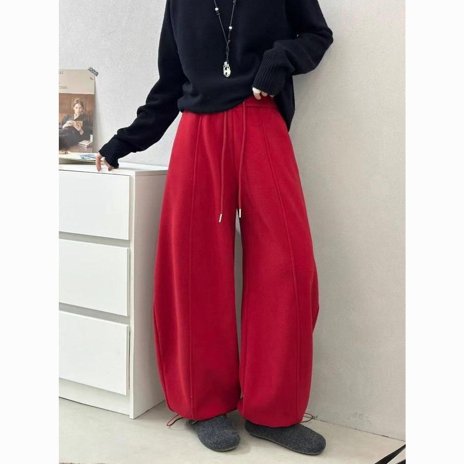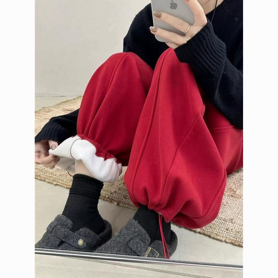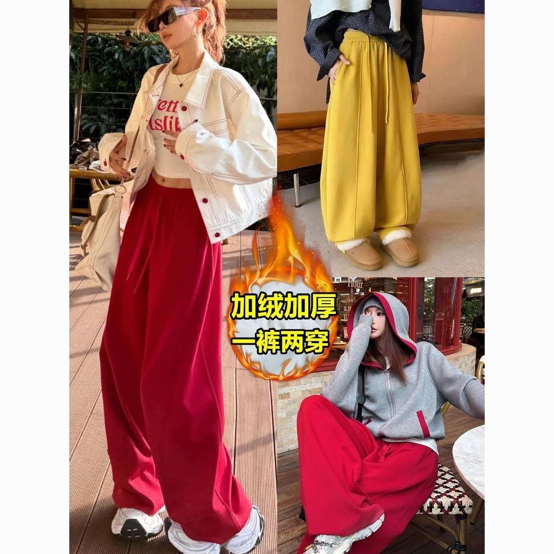 【新年红】高腰抽绳加绒加厚休闲裤女2025冬新款宽松弯刀运动卫裤